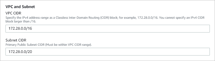 Depending on the option selected at step 5a, you can either select an existing Amazon VPC and subnet, or specify IPv4 address ranges in the CIDR notation for the new Amazon VPC and subnet.