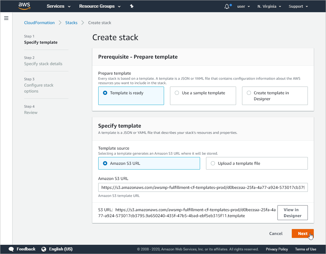 In the Create stack wizard, you will create a stack for Veeam Backup for AWS.
