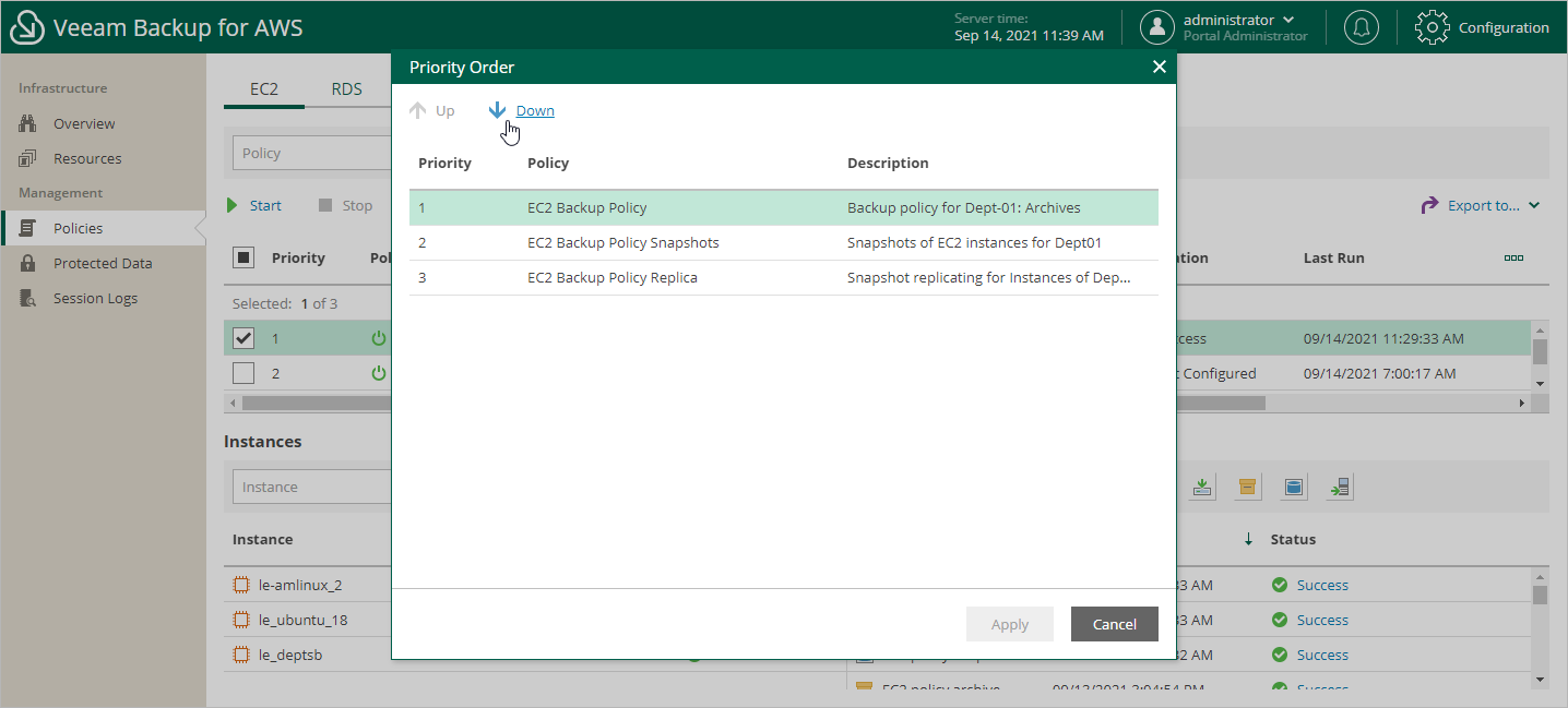 - In the Priority Order window, use the Up and Down arrows to set priority for backup policies, and click Apply to save the settings.
