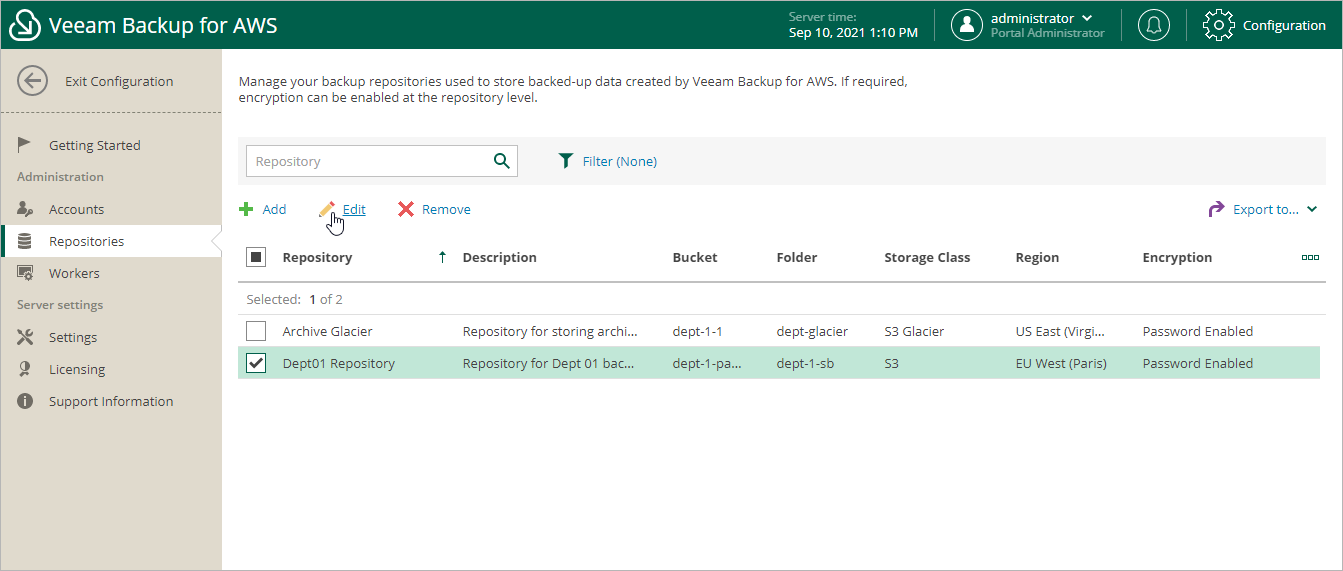 For each backup repository, you can modify settings configured while adding the repository to the Veeam Backup for AWS infrastructure:
