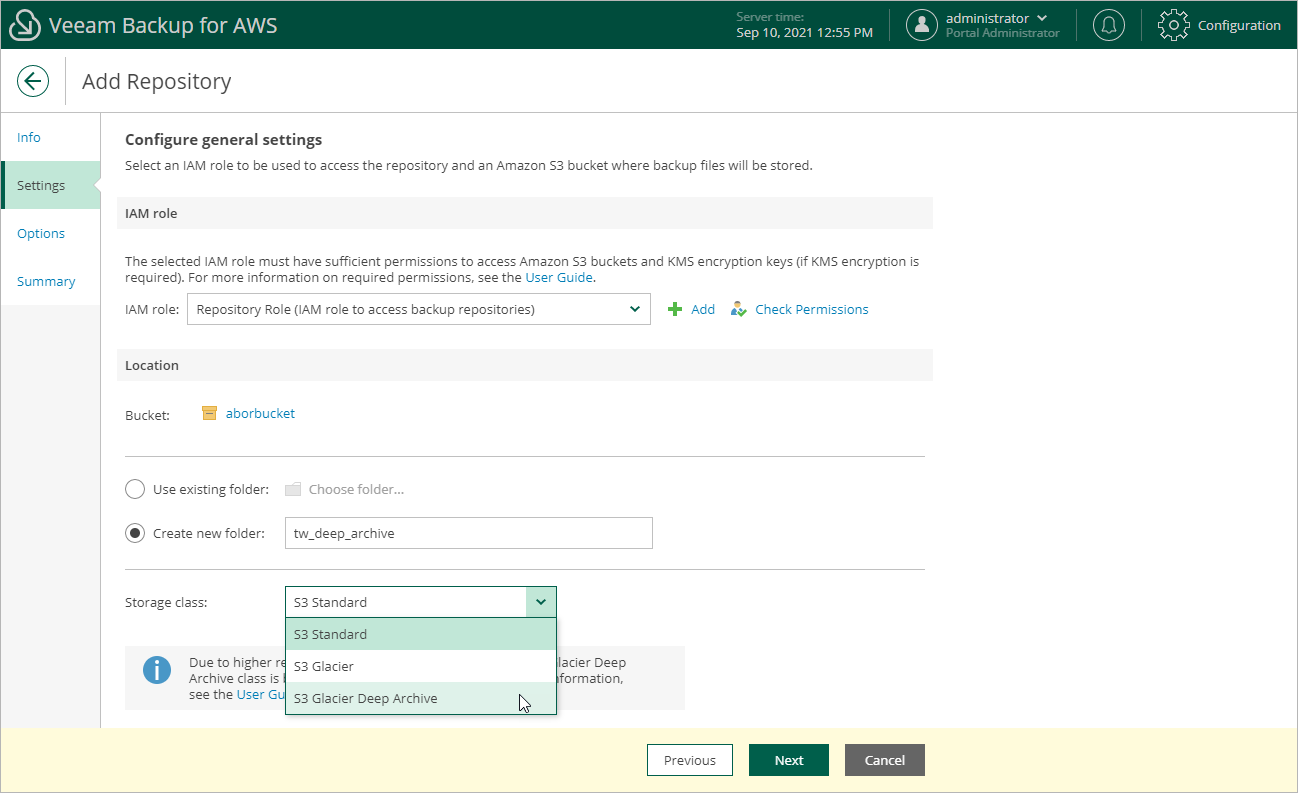 • The created backup repository will have the storage class that has been specified when creating the folder. You cannot change the storage class for the repository.