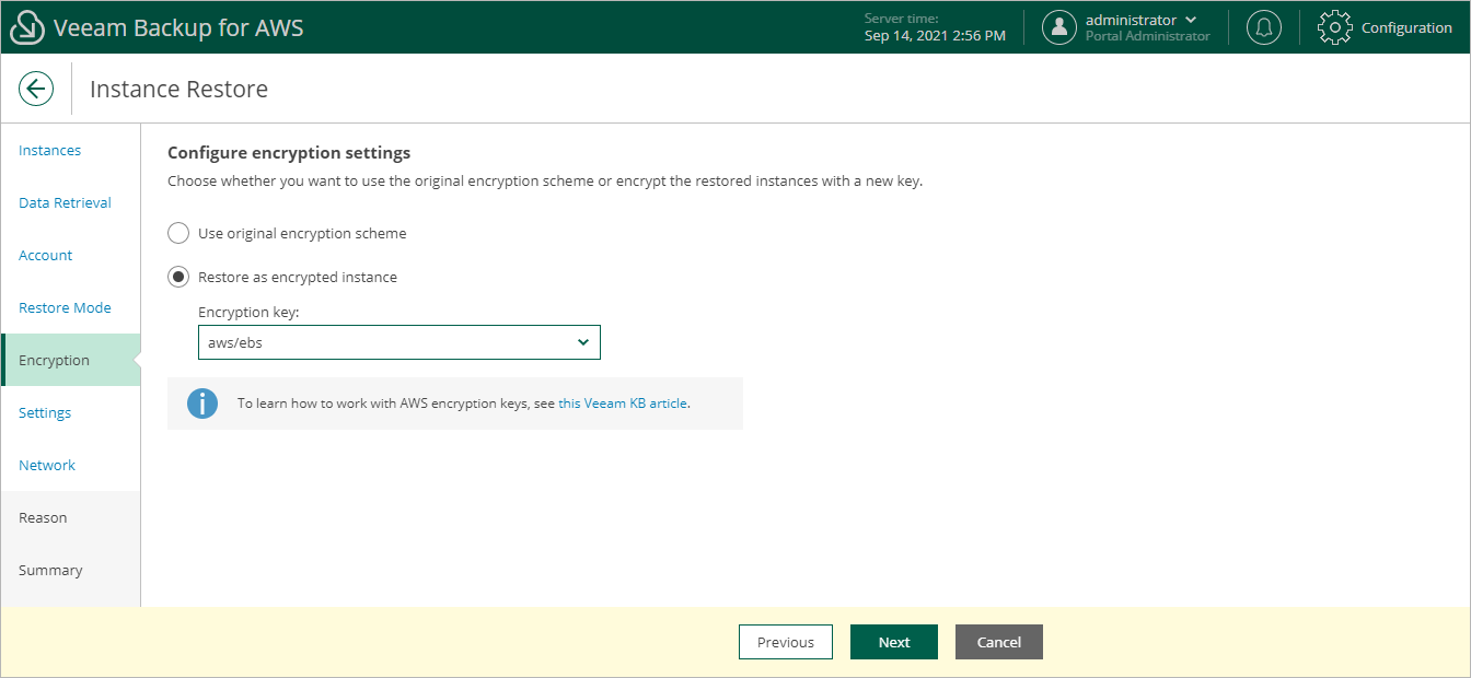 At the Encryption step of the wizard, choose whether the restored EBS volumes of the processed EC2 instance must be encrypted with AWS KMS keys: