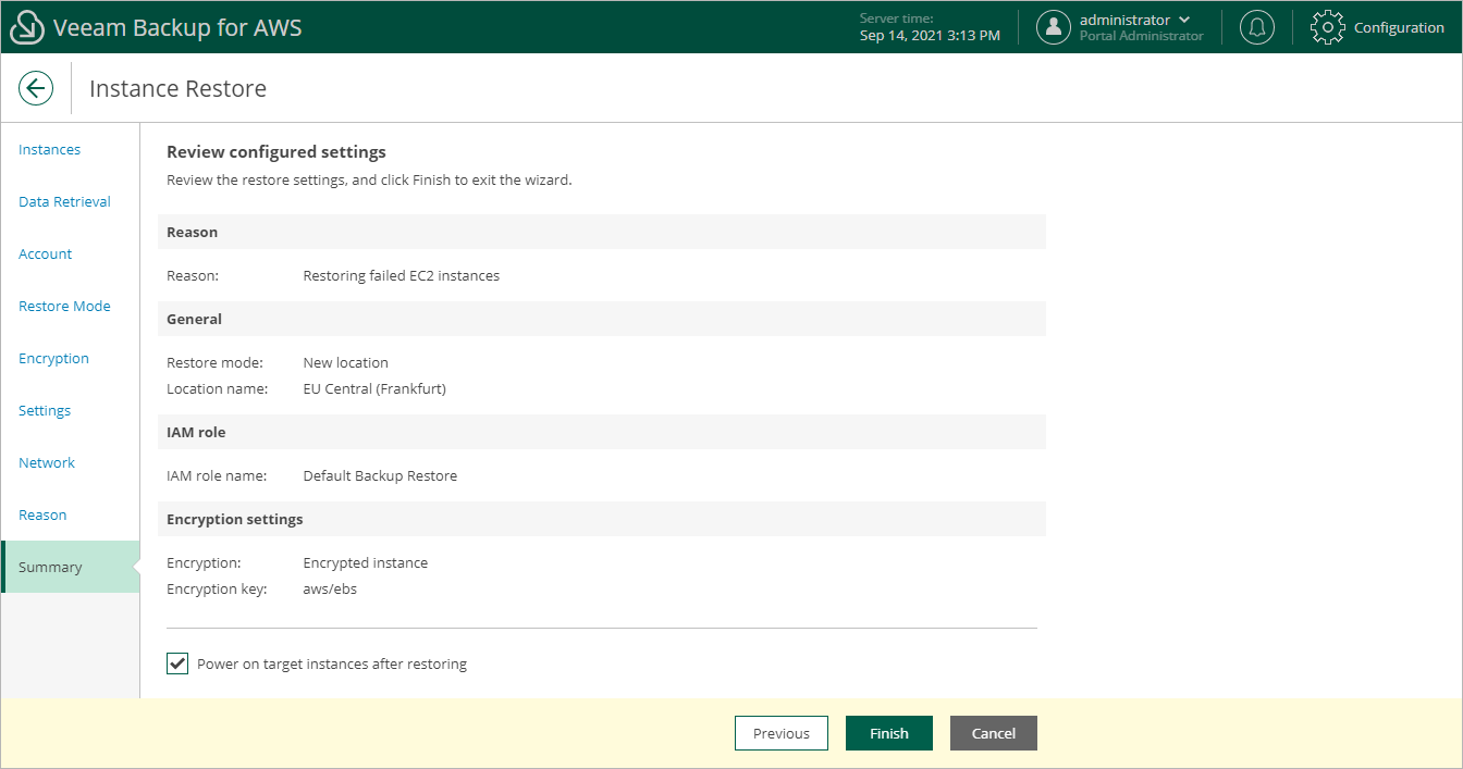 If you want to start the restored EC2 instance as soon as the restore process completes, select the Power on target instance after restoring check box.