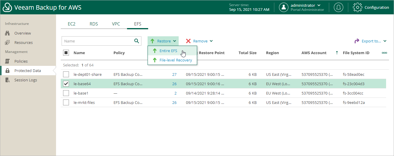 2. Click Restore > Entire EFS.
