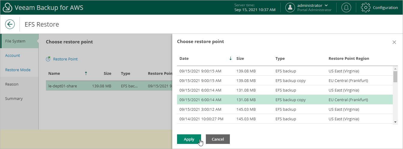 At the File System step of the wizard, select a restore point that will be used to restore the selected EFS file system. By default, Veeam Backup for AWS uses the most recent valid restore point. However, you can restore the file system to an earlier state.