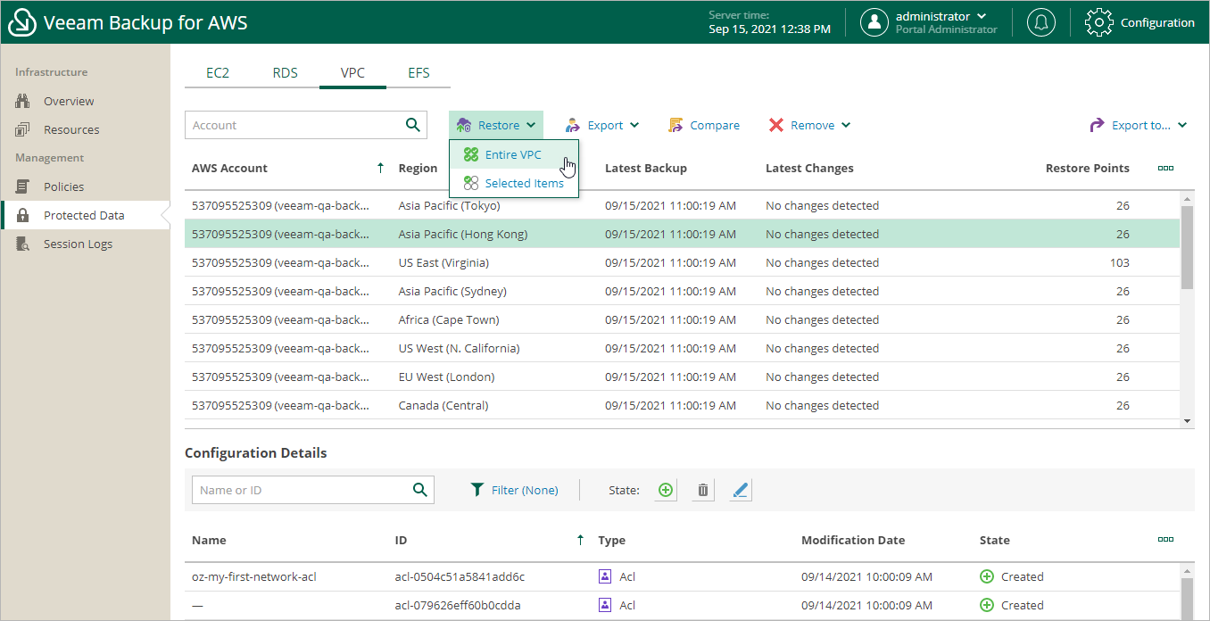 3. Click Restore > Entire VPC.