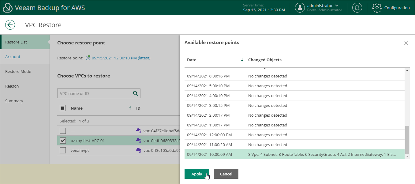 2. In the Available restore points window, select the necessary restore point and click Apply.