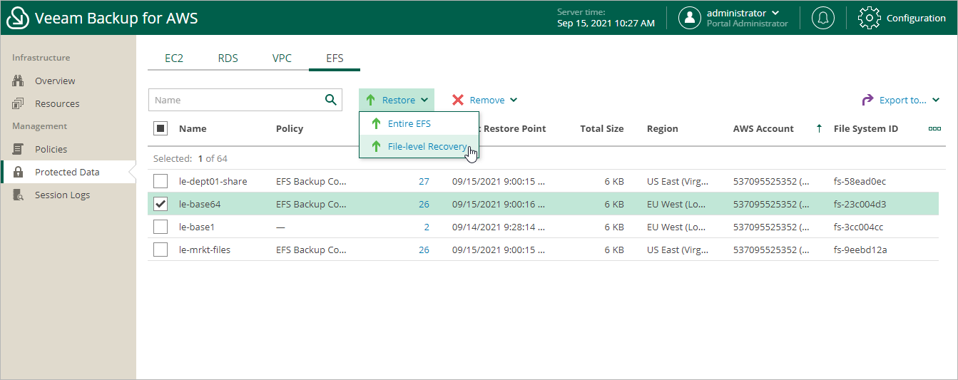 - Select the file system whose files and folders you want to recover, and click Restore > File-level Recovery.