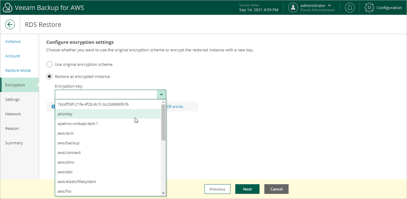 For a KMS key to be displayed in the list of available encryption keys, it must be stored in the AWS Region selected at step 4 and the IAM role specified for the restore operation must have permissions to the key. For more information on KMS keys, see AWS Documentation.