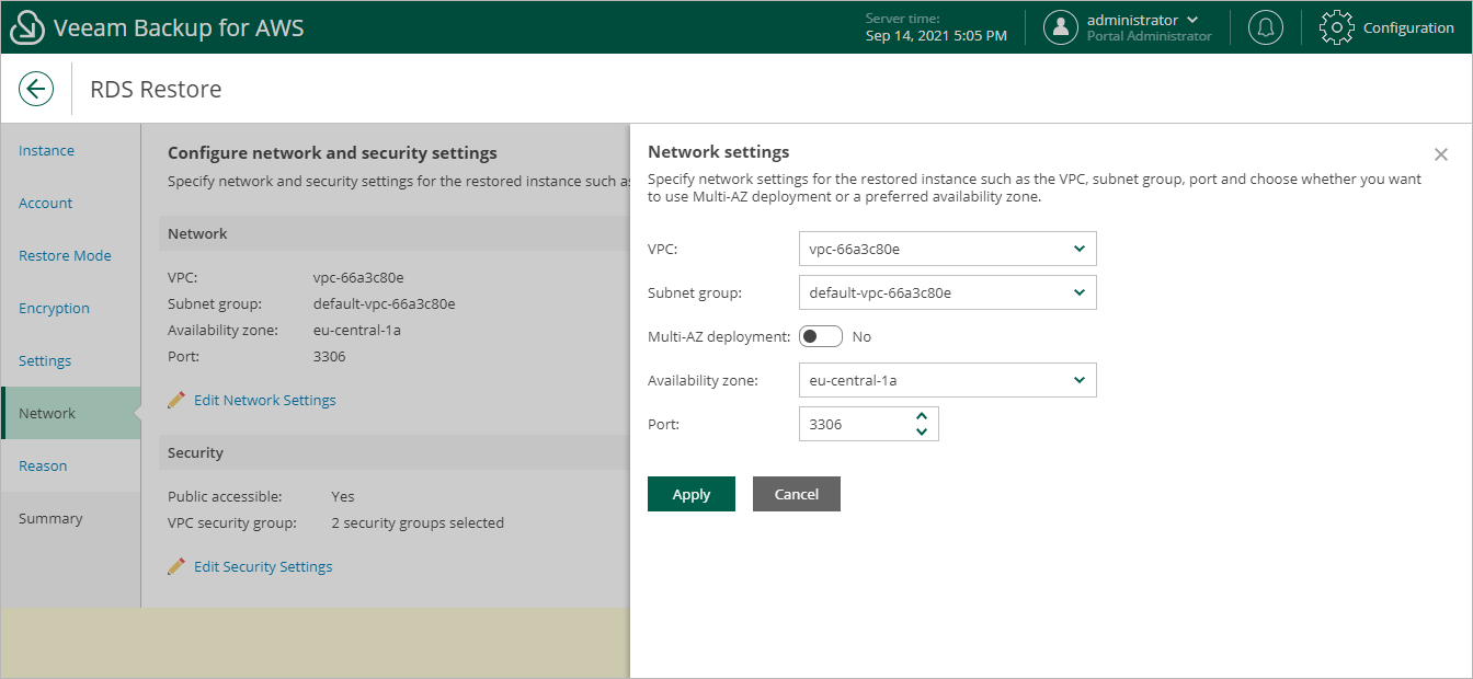 - In the Network settings window, choose an Amazon VPC to which the restored RDS instance will be connected, a subnet group that will be assigned to the instance, an Availability Zone where the instance will reside, and port that must be used to access the RDS instance. Note that Veeam Backup for AWS will display only Amazon VPCs that have one or more subnet groups in the VPC drop-down list.