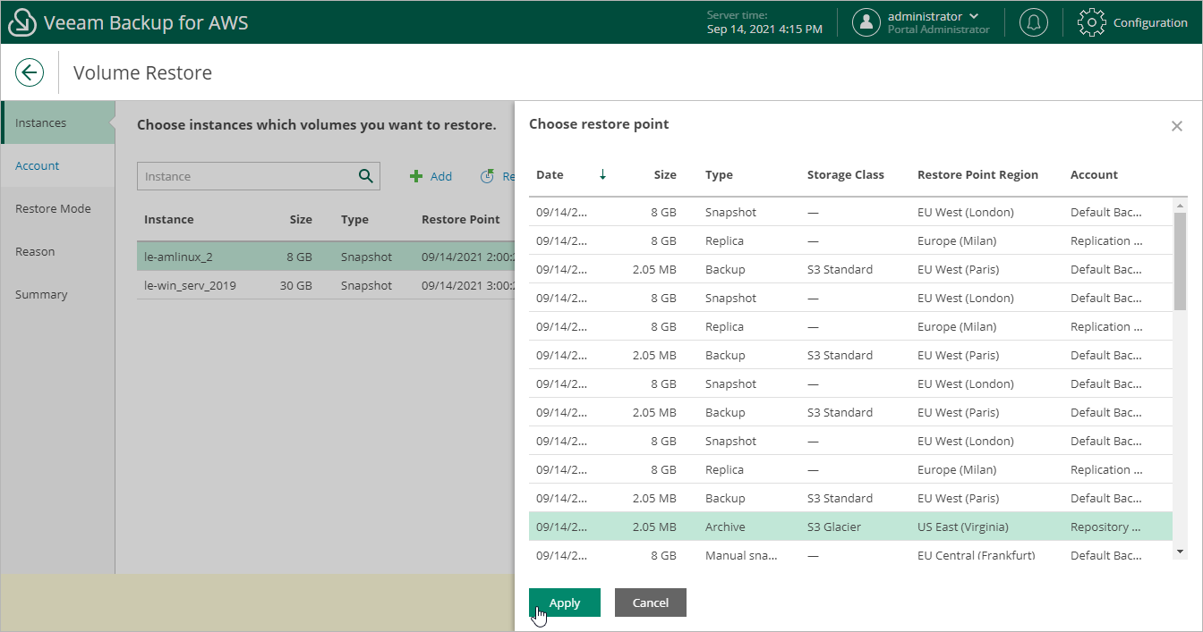 By default, Veeam Backup for AWS uses the most recent valid restore point. However, you can restore the EBS volumes to an earlier state.