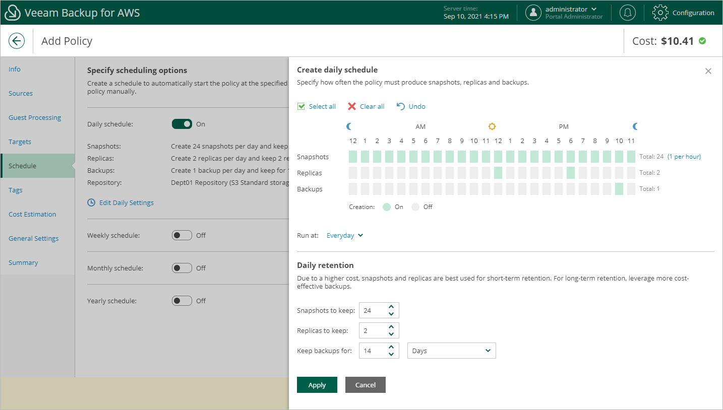 - In the Create daily schedule window, select hours when the backup policy will create cloud-native snapshots, snapshot replicas or image-level backups.