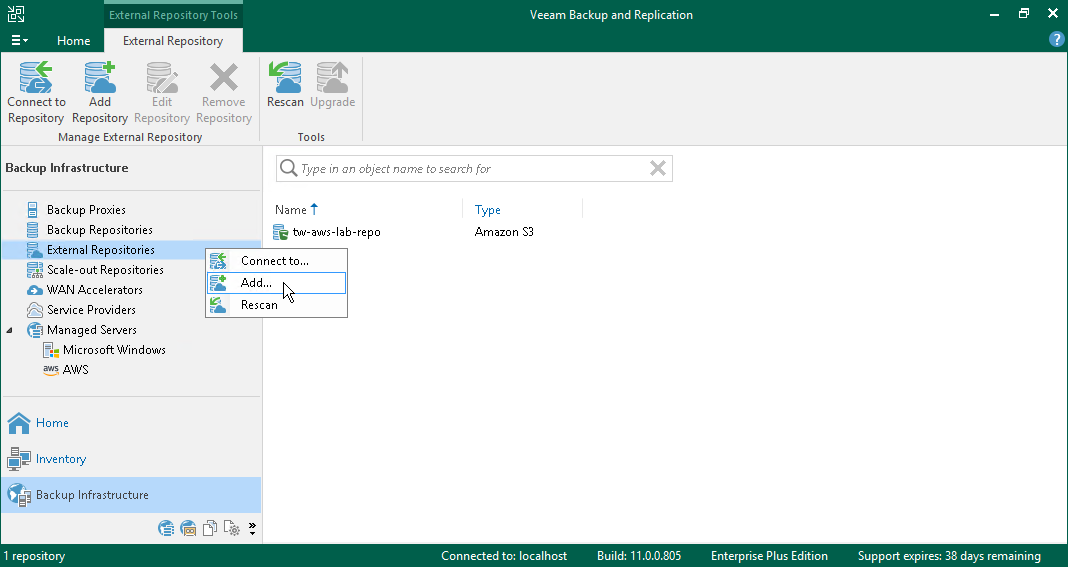 - In the inventory pane, select the External Repositories node and click Add Repository on the ribbon. In the Add External Repository window, select Veeam Backup for AWS > Amazon S3.