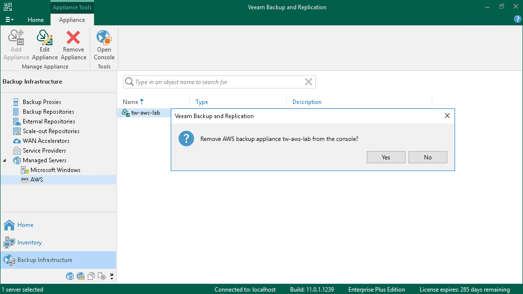 If you do not plan to manage an appliance using the Veeam Backup & Replication console, you can remove the appliance from the Veeam Backup & Replication infrastructure only. If you do not plan to use the appliance anymore, you can remove it from both the Veeam Backup & Replication and AWS infrastructures.