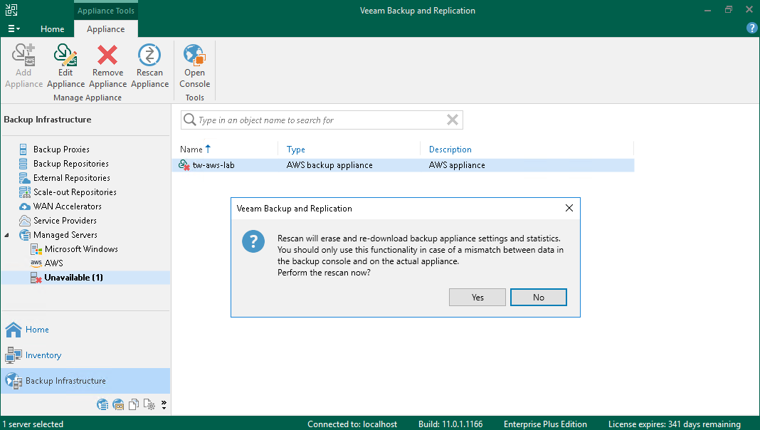 - In the working area, select the necessary Veeam Backup for AWS appliance, and click Rescan appliance on the ribbon. Alternatively, you can right-click the appliance and select Rescan.