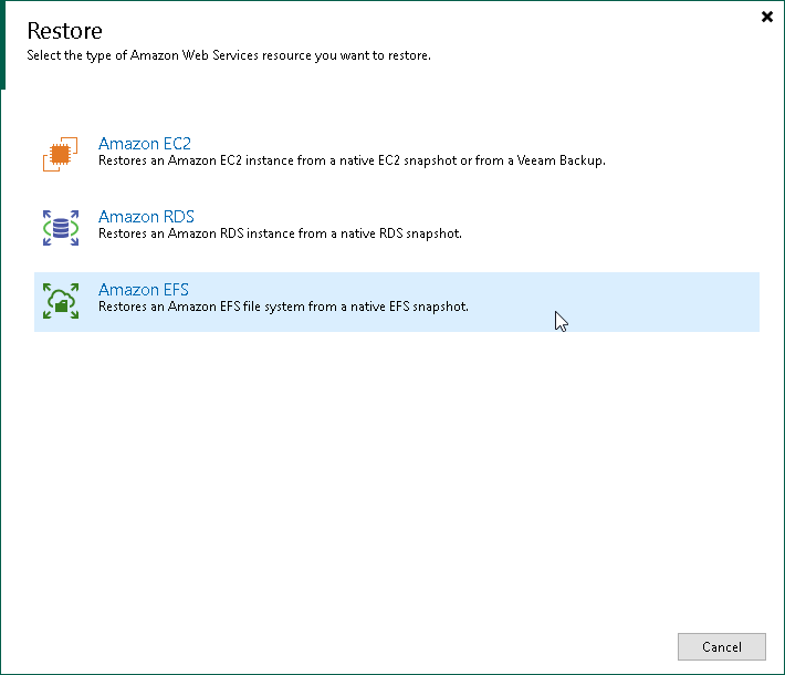 - On the Home tab, click Restore > AWS. In the Restore window, select Amazon EFS.