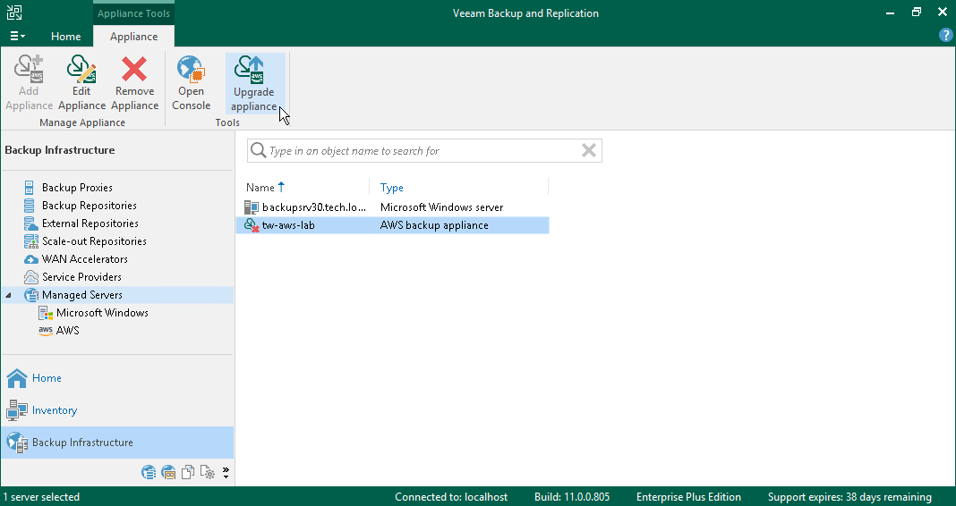 - In the working area, select the Veeam Backup for AWS appliance that you want to upgrade, and click Upgrade appliance on the ribbon. Alternatively, right-click the appliance and select Upgrade.