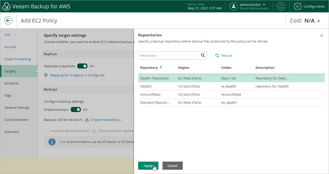 - In the Repositories window, select an archive repository where the archived data will be stored, and click Apply.