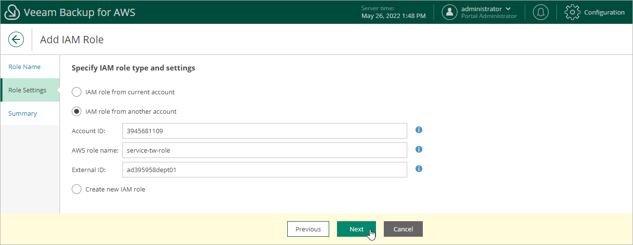 The cross-account IAM role must be created in the trusting account beforehand, and must allow the trusting account to share AWS services and resources with the trusted account — an AWS account where the backup appliance belongs. To learn how to create cross-account IAM roles, see AWS Documentation.
