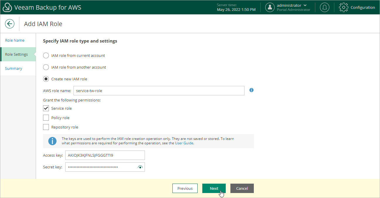 Veeam Backup for AWS does not store one-time access keys in the configuration database. |