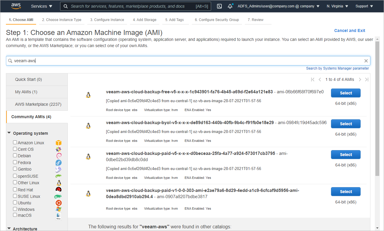 - At the Choose an Amazon Machine Image (AMI) step of the wizard, open the Community AMIs tab. Then, in the search field, type veeam-aws and press [ENTER] on the keyboard.