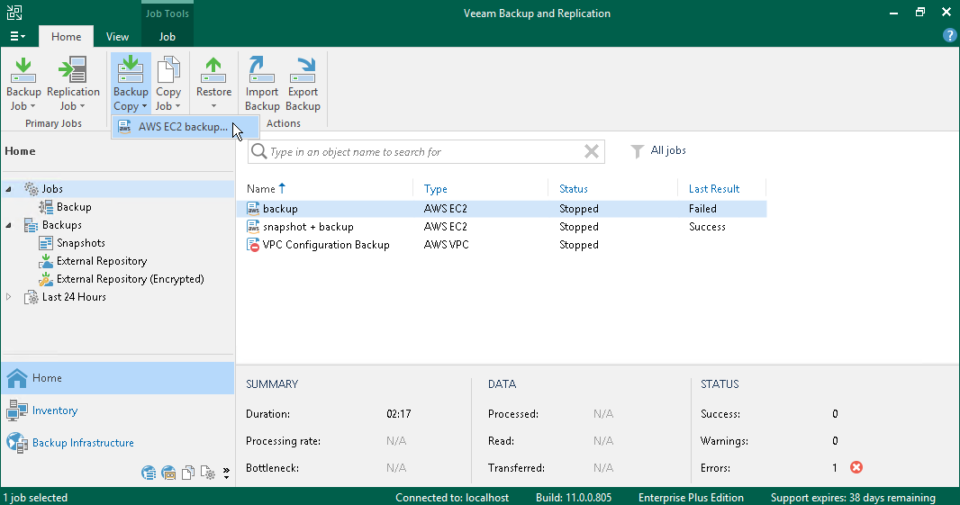 - On the Home tab, click Backup Copy and select AWS EC2 backup.