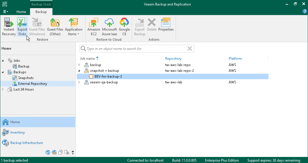 - Launch the Export Disk wizard. To do that, open the Home view. In the inventory pane, navigate to Backups > External Repository. In the working area, select EC2 instances whose disk you want to export. On the ribbon, click Export Disks.