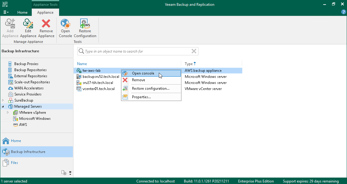 - In the working area, select the Veeam Backup for AWS appliance whose Web UI you want to open, and click Open Console on the ribbon. Alternatively, right-click the appliance and select Open console.