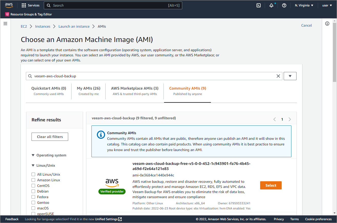 - At the Application and OS Images (Amazon Machine Image) step of the wizard, choose an AMI that will be used to deploy the appliance. To do that, type veeam-aws-cloud-backup in the search field, press [ENTER] on the keyboard. You will be redirected to the Choose an Amazon Machine Image (AMI) page.