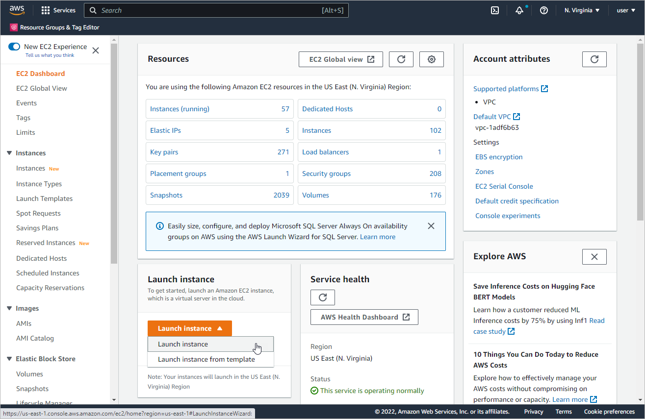 - On the EC2 Dashboard tab, click Launch instance > Launch instance. The Launch an instance wizard will open.