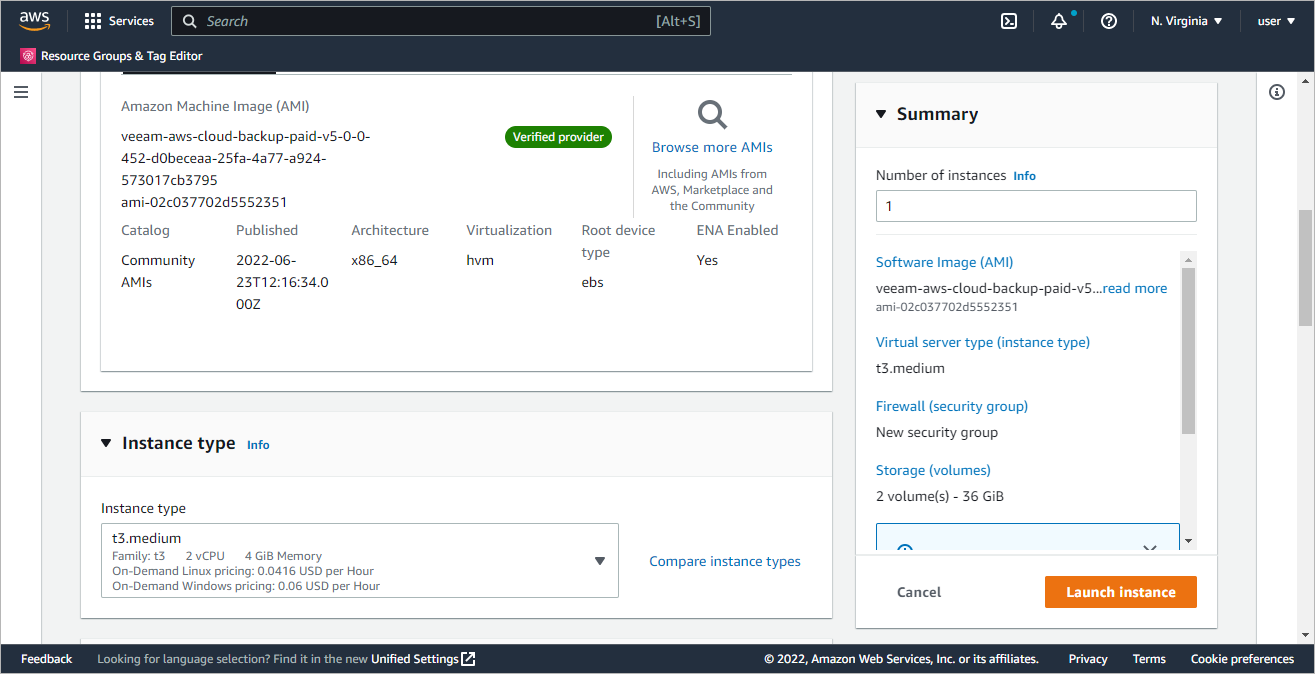 - Back to the wizard, at the Instance type step, select an EC2 instance type for the backup appliance. The minimum recommended EC2 instance type is t3.medium.