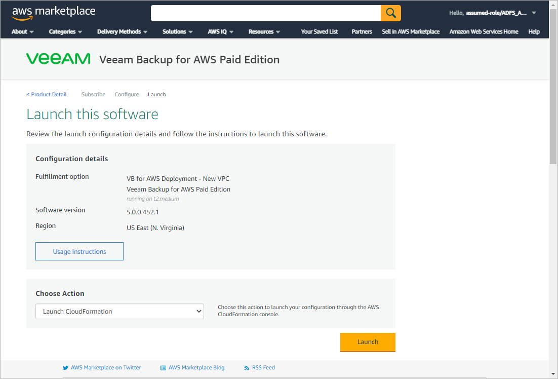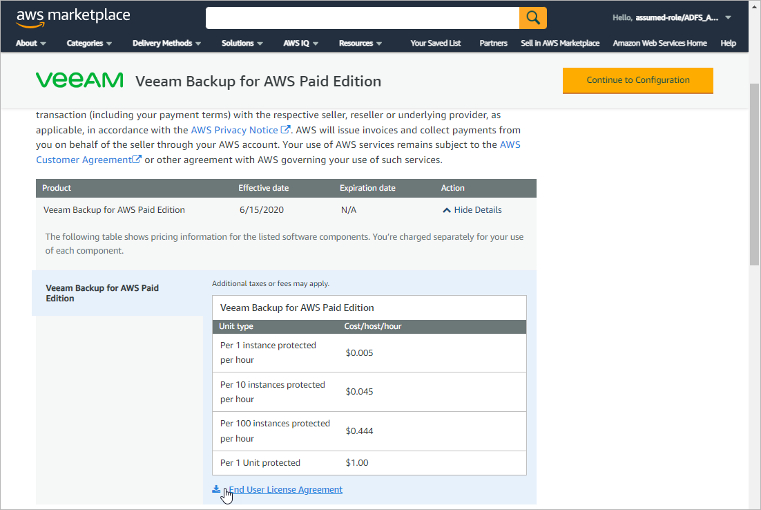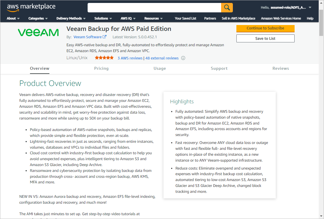 - Log in to AWS Marketplace using credentials of an AWS account in which you plan to install Veeam Backup for AWS.