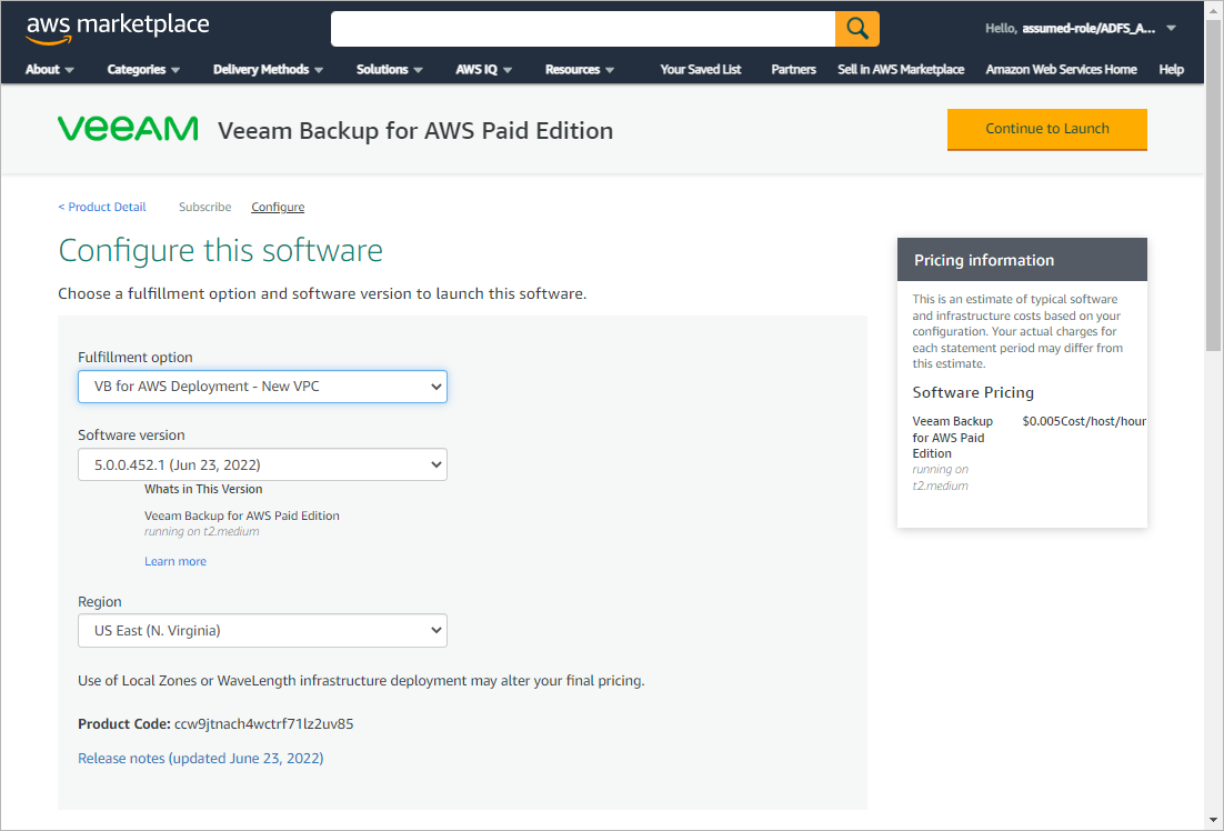 - From the Software Version drop-down list, select the latest version of Veeam Backup for AWS.