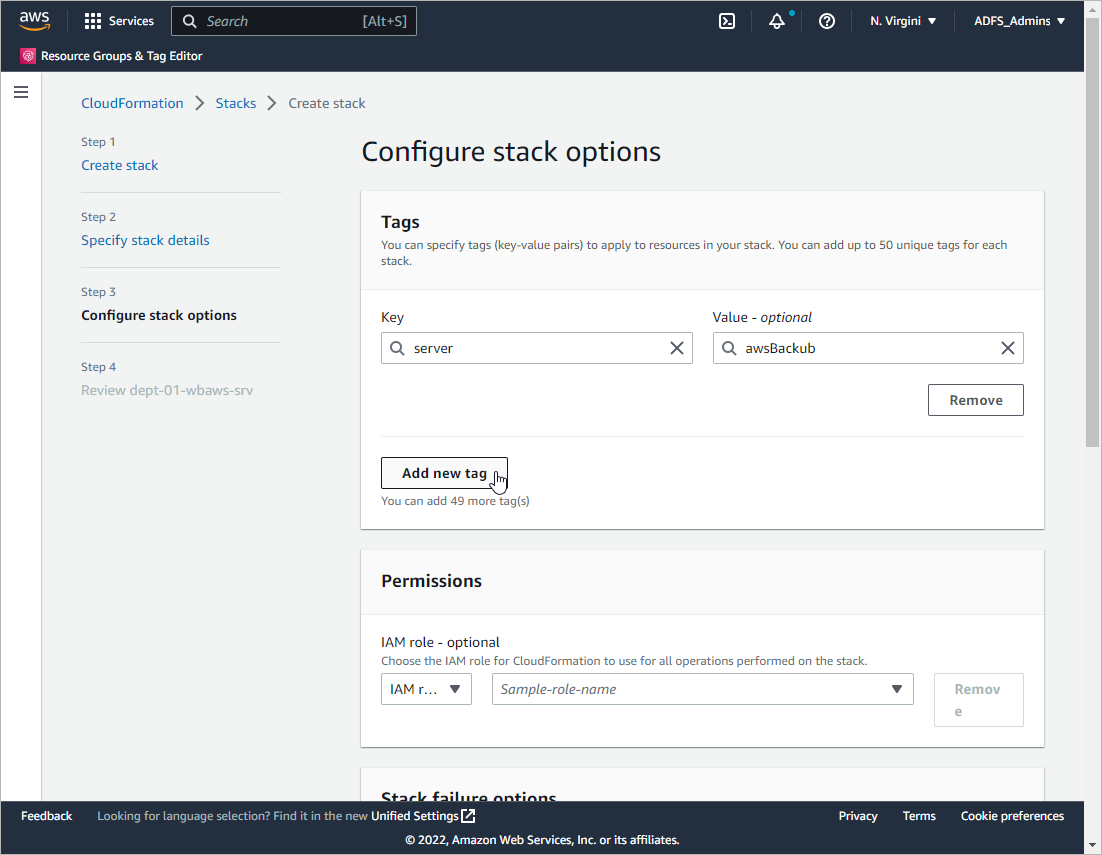 - At the Configure stack options step of the wizard, specify AWS tags, IAM role permissions and other additional settings for the stack.