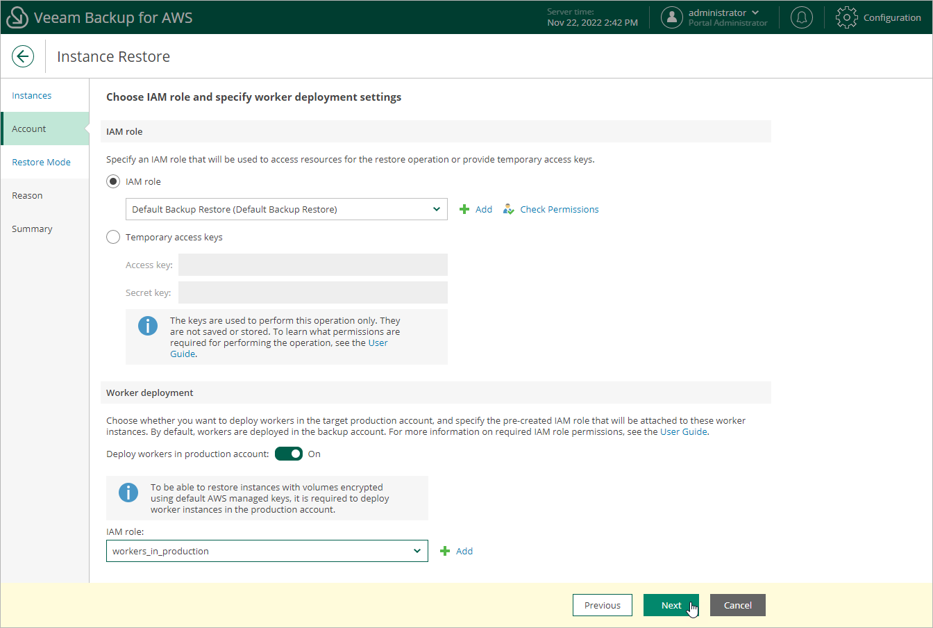 At the Account step of the wizard, choose whether you want to use an IAM role or one-time access keys of an IAM user to allow Veeam Backup for AWS to perform the restore operation, and whether you want Veeam Backup for AWS to deploy worker instances in the production account — account to which the specified role or user belongs. For information on what permissions the IAM role or IAM user must have to perform restore, see EC2 Restore IAM Permissions.