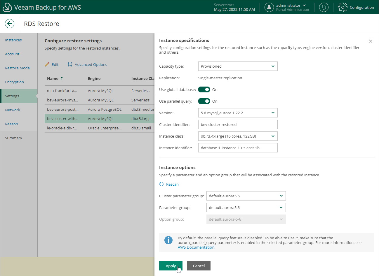 You cannot change replication settings for restored Aurora DB clusters. Veeam Backup for AWS restores the clusters with the same replication settings configured for the source clusters. |