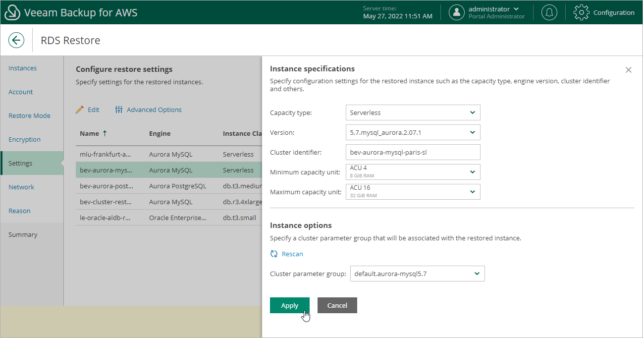Veeam Backup for AWS supports Aurora Serverless v2. To restore the primary DB instance of the provisioned cluster as an Aurora Serverless v2 DB instance, select db.serverless from the Instance class drop-down list. Mind the following limitations: