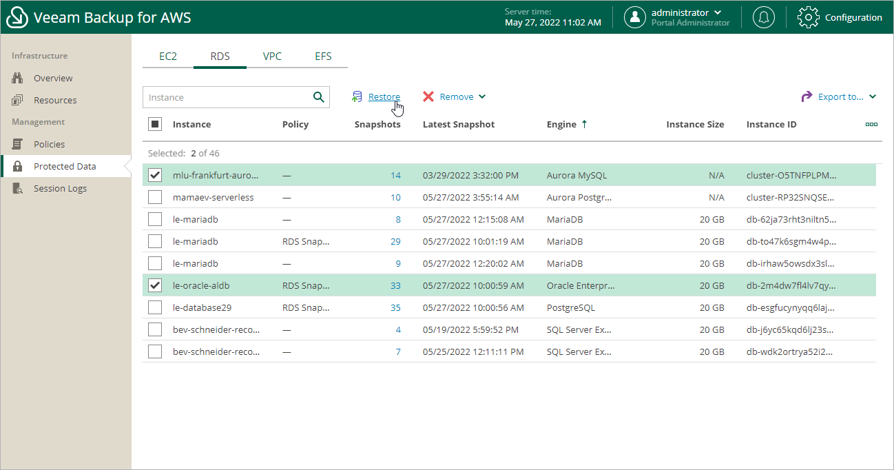 Alternatively, click the link in the Snapshots column. Then, in the Available Restore Points window, select the necessary restore point and click Restore.