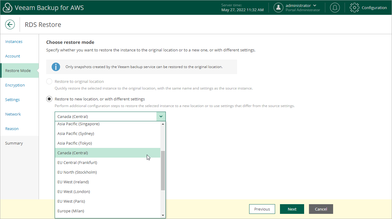 At the Restore Mode step of the wizard, choose whether you want to restore the selected RDS resources to the original or to a custom location. If you select the Restore to new location, or with different settings option, specify the target AWS Region where the restored DB instances and Aurora DB clusters will operate.