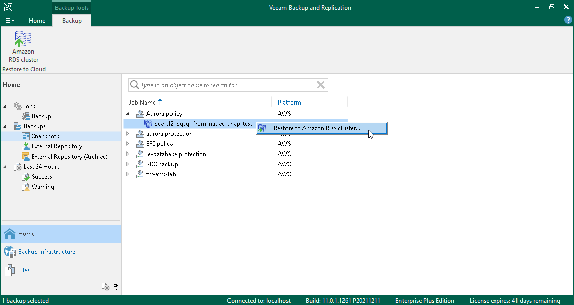 - Open the Home view. In the inventory pane, navigate to the Backups > Snapshots node. In the working area, expand the necessary backup policy, select Aurora DB clusters that you want to restore and click Amazon RDS cluster on the ribbon. Alternatively, right-click one of the selected clusters and select Restore to Amazon RDS cluster.