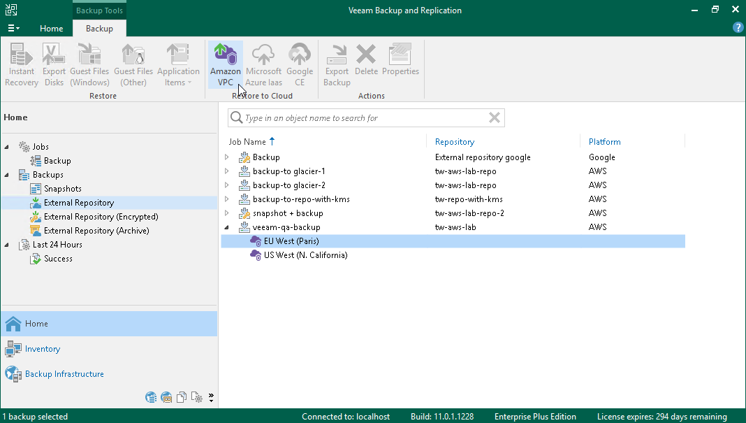 - Launch the VPC Restore wizard. To do that, open the Home view and navigate to the Backups > External Repository node in the inventory pane. In the working area, select the AWS Region for which you want to restore the VPC configuration. On the ribbon, click Amazon VPC.