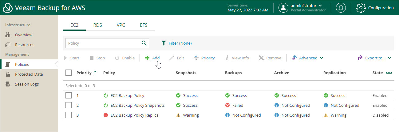 This is an archive version of the document. To get the most up-to-date information, see the current version. Step 1. Launch Add EC2 Policy Wizard To launch the Add EC2 Policy wizard, complete the following steps.Navigate to Policies > EC2.Click Add.