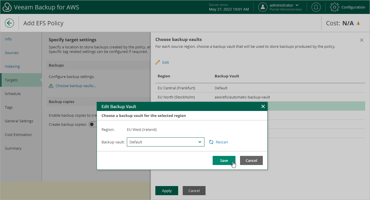 For a backup vault to be displayed in the Backup vault list, it must be created in the AWS Backup console as described in AWS Documentation. If you have not created a backup vault for the selected AWS Region, Veeam Backup for AWS will display only the default backup vault existing in this region.