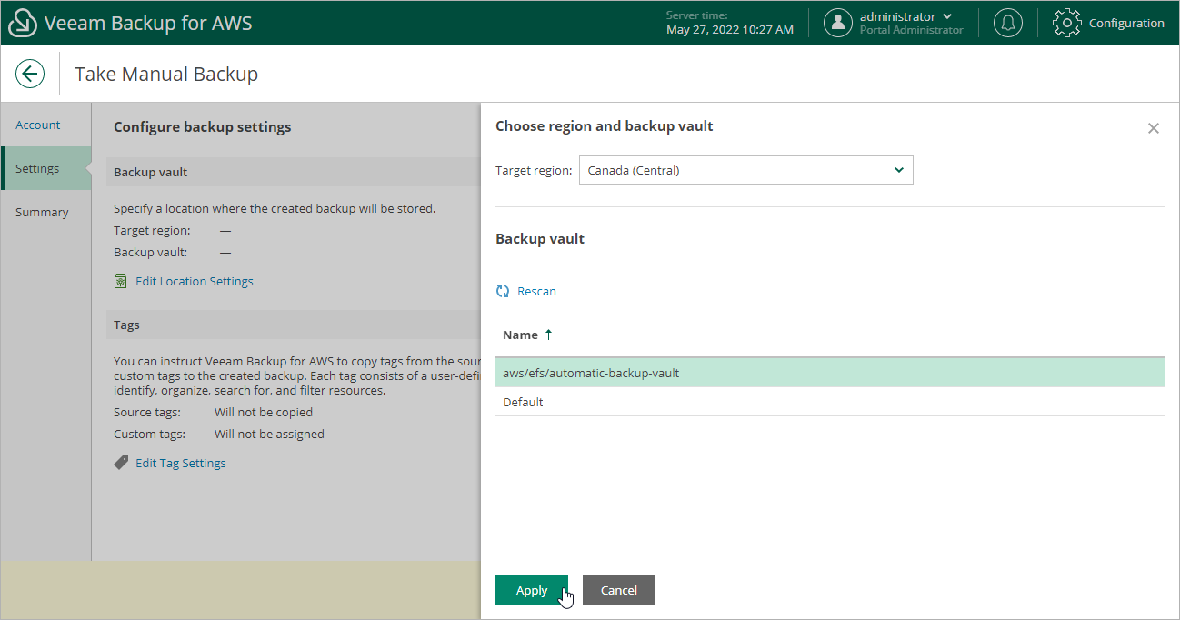 - From the Target region drop-down list, select an AWS Region where manual backups will be stored.