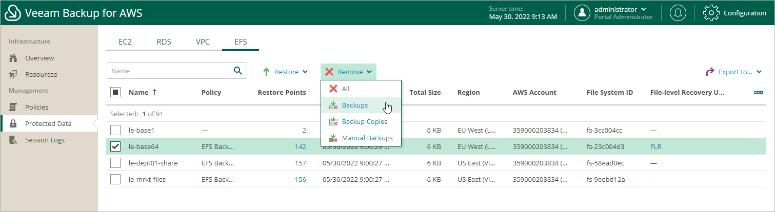 Veeam Backup for AWS applies the configured retention policy settings to automatically remove EFS file system backups and backup copies created by backup policies. If necessary, you can also remove the backed-up data manually.