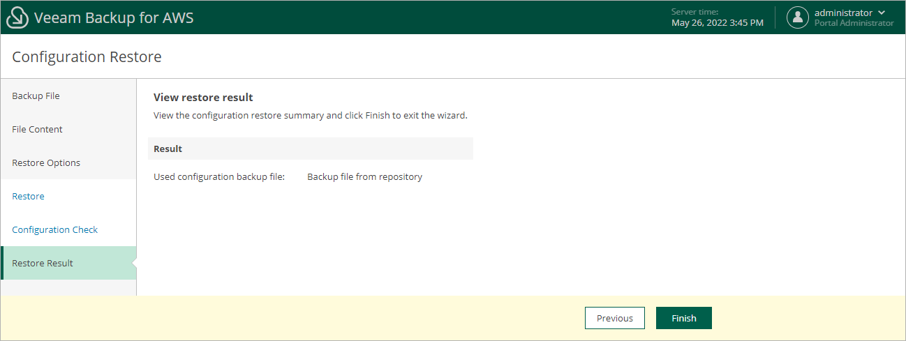 This is an archive version of the document. To get the most up-to-date information, see the current version. Step 7. Finish Working with Wizard At the Summary step of the wizard, click Finish to finalize the process of configuration data restore.