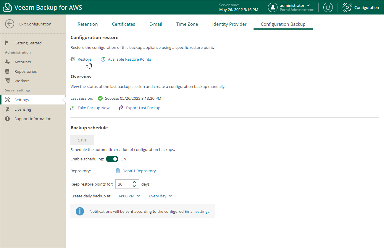 3. In the Configuration restore section, click Restore.