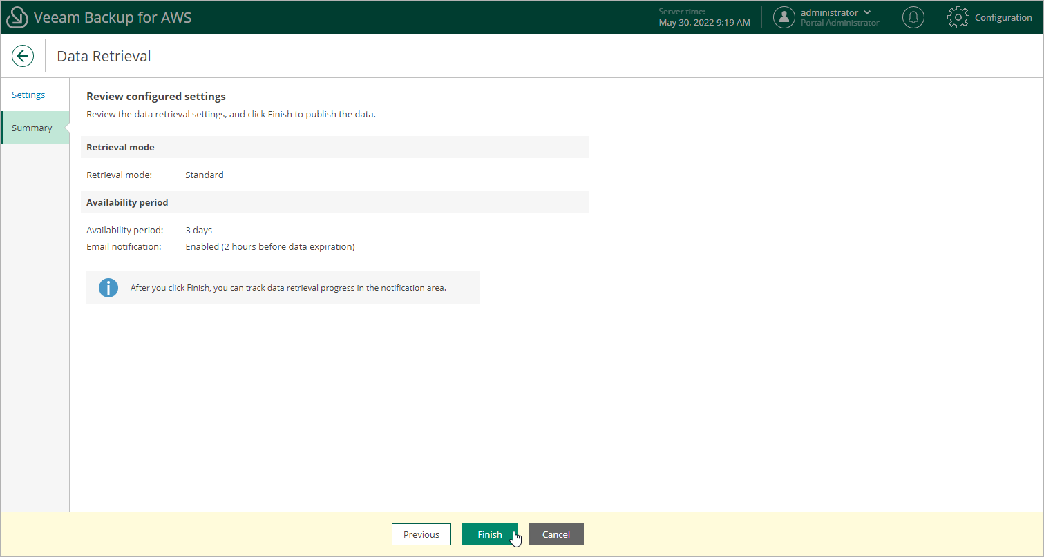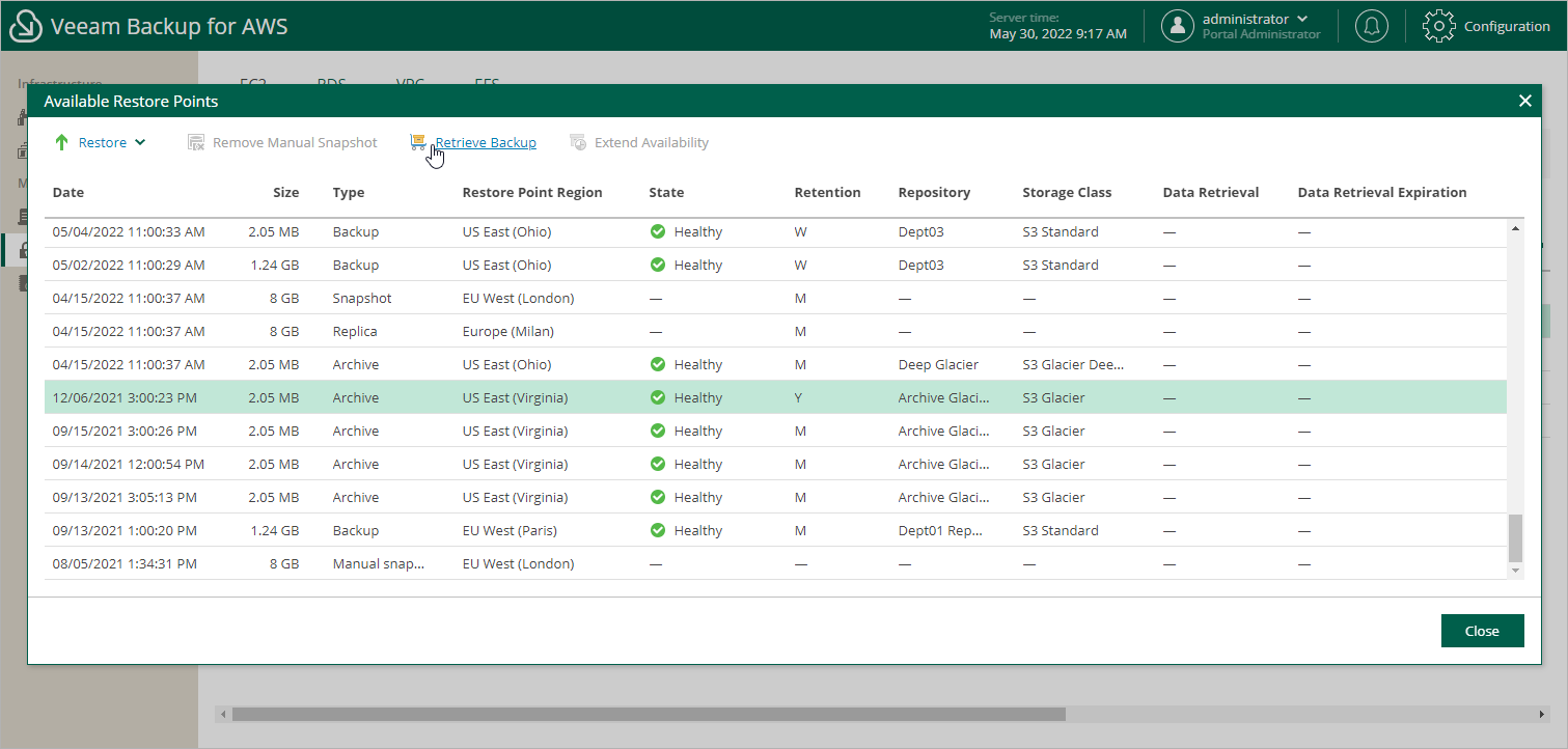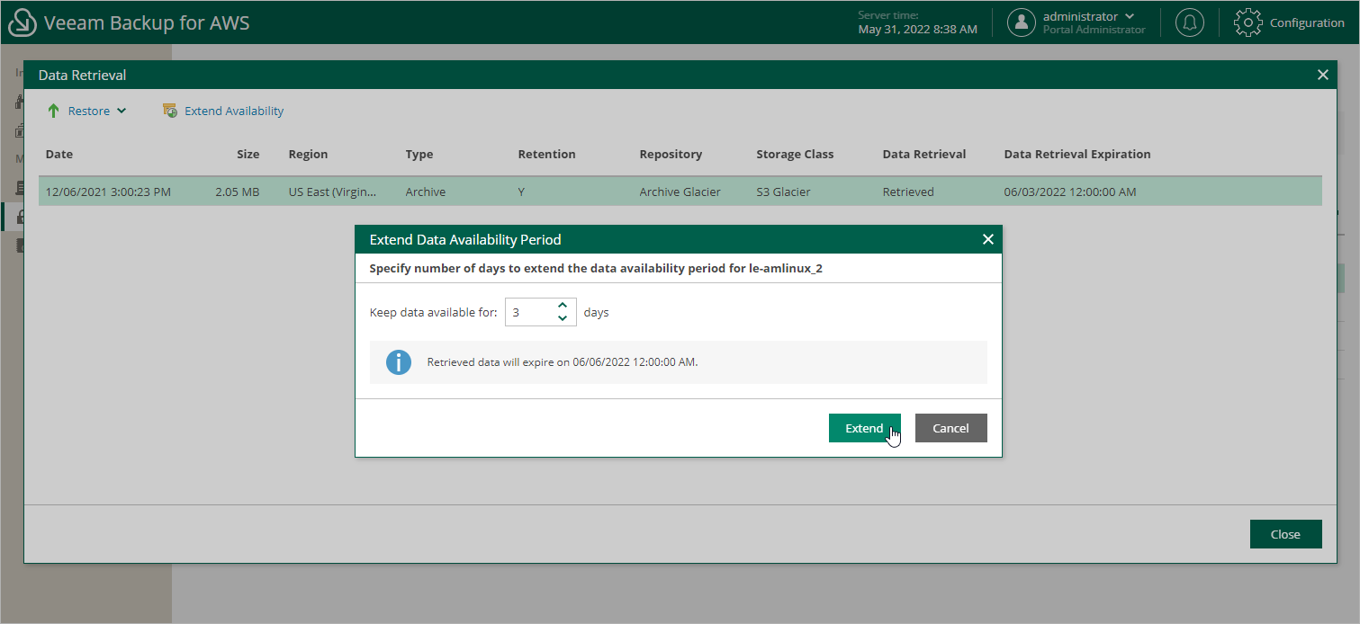 If you cancel the Data Retrieval session, or the Veeam Backup for AWS service is restarted while the Data Retrieval session is still running, AWS will retrieve data anyway and keep it for the specified availability period. However, Veeam Backup for AWS will not be able to access the retrieved data. |