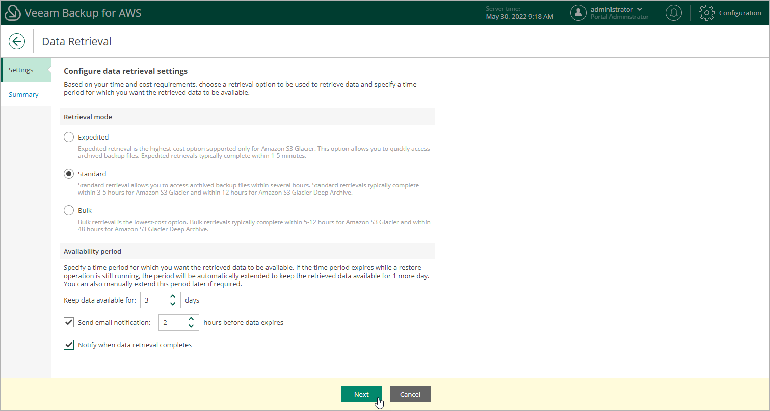 - In the Retrieval mode section, select the retrieval option that Veeam Backup for AWS will use to retrieve the data.