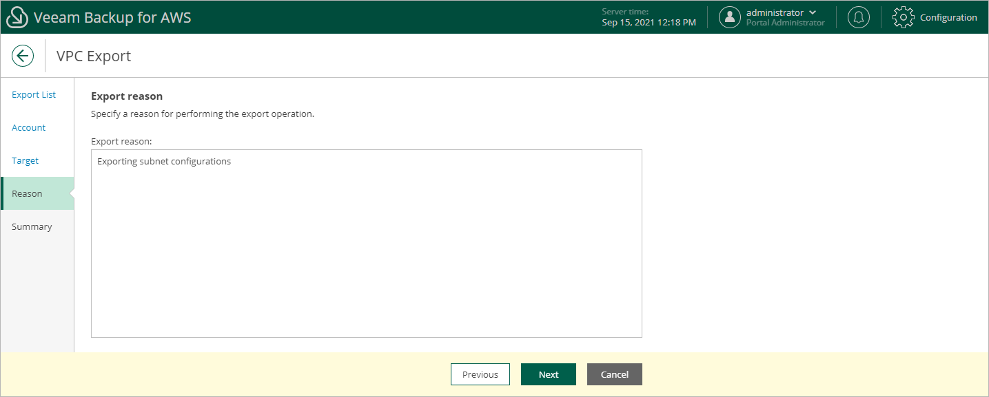 At the Reason step of the wizard, specify a reason for the export of the VPC configuration items. The information you provide will be saved in the session history and you can reference it later.